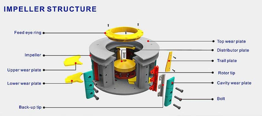 Stone Beat Stone: The materials fall vertically and uniformly from the top of the machine. One part of them enters into the revolving impeller at high speed through the distributor and feed pipe and is shot out from the discharge outlet of the impeller by the action of the high-speed centrifugal force. Then at high speed, they are smashed with another part of the materials that have been distributed around the impeller through the distributor. After smashing each other the materials shall form a whirlpool and impact many times caused by striking and attrition in the impeller and crushing chamber.